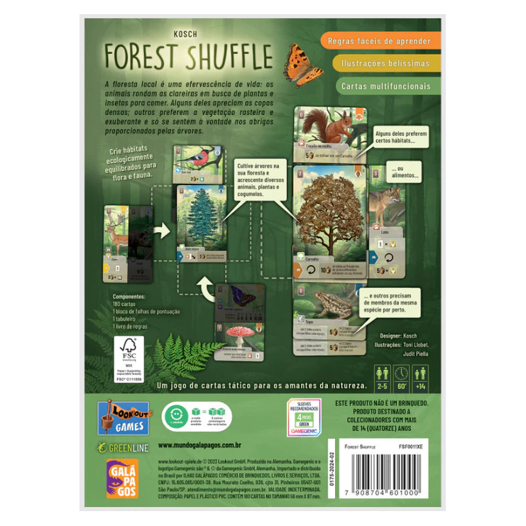 Em Forest Shuffle crie hábitats ecologicamente equilibrados para flora e fauna. Cultive árvores na sua floresta e acrescente diversos animais, plantas e cogumelos. Alguns animais preferem certos hábitats ou alimentos, enquanto outros precisam de membros da mesma espécie por perto.